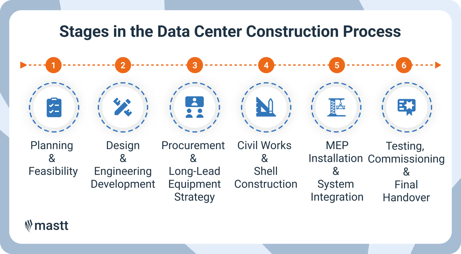 A full data center build — from concept to commissioning — typically takes 18 to 30 months, according to industry analyses from Mastt. That is the construction timeline alone.